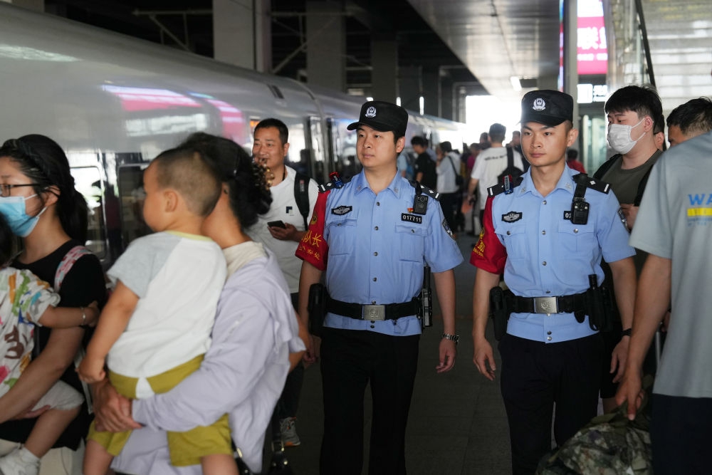 ↑石家庄站派出所执勤四队队长梁烁(左)带领队员在大客流乘降站台巡逻防控。