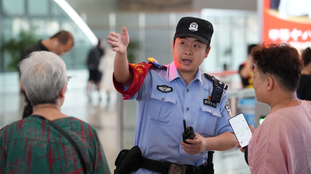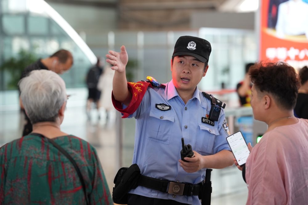 ↑石家庄站派出所执勤四队队长梁烁在候车室为旅客答疑解惑。