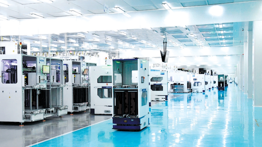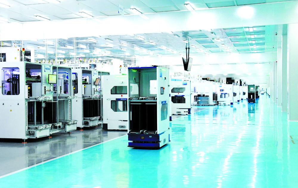 在石家庄晶澳太阳能科技有限公司数字化生产车间,AGV物料智能配送机器人往来穿梭。