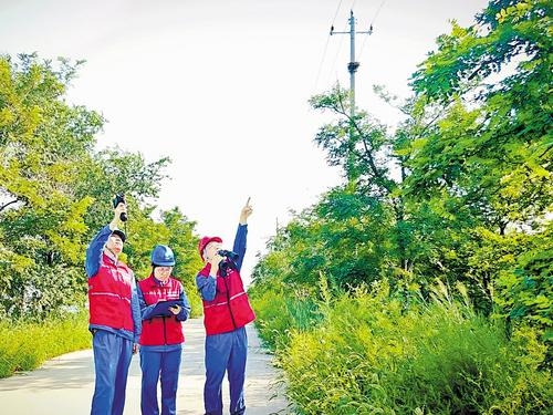 8月15日,国网沧州供电公司大运河(渤海新区)共产党员服务队队长潘小佳(右一)和同事在巡线的同时,检查电线杆上的鸟巢。记者 袁铮 摄