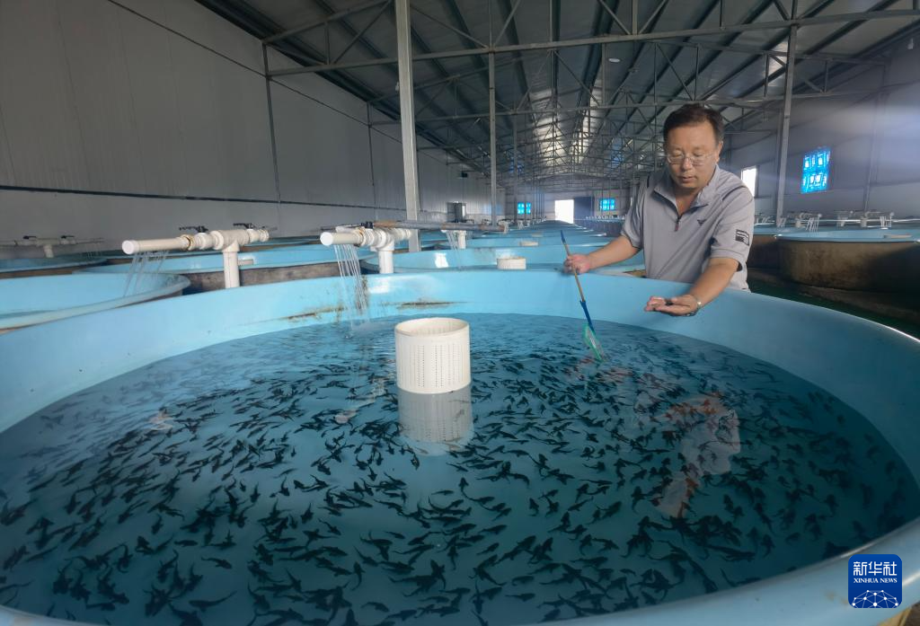邯郸市鲟鲵农业科技股份有限公司工作人员查看鲟鱼鱼苗长势。新华社记者 王昆 摄