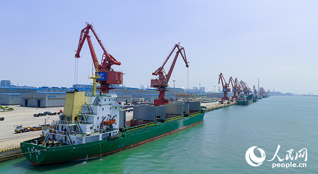 首钢京唐成品码头高耸的港吊。人民网记者 李兆民摄