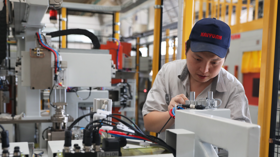 在位于唐山市高新区的唐山开元自动焊接装备有限公司组装车间,技术人员近日正调试一套全新的焊接机器人系统,该产品将应用于国内一些新能源汽车生产商的减震器生产线。