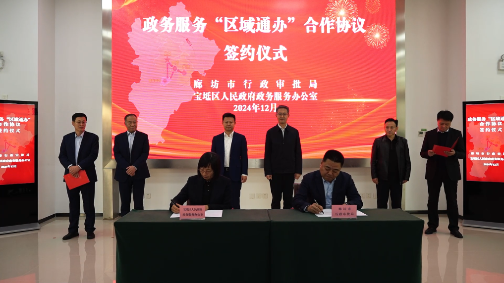 12月13日,河北省廊坊市行政审批局与天津市宝坻区人民政府政务服务办公室共同签署《政务服务“区域通办”合作协议》,京津冀政务服务跨省联动“朋友圈”进一步扩大。