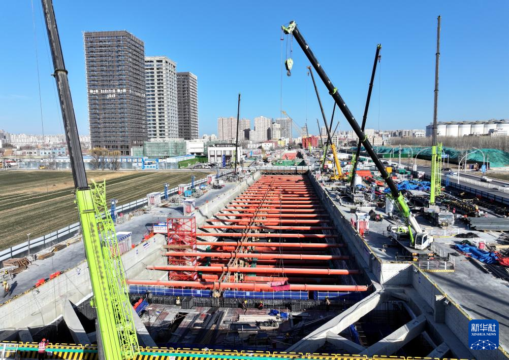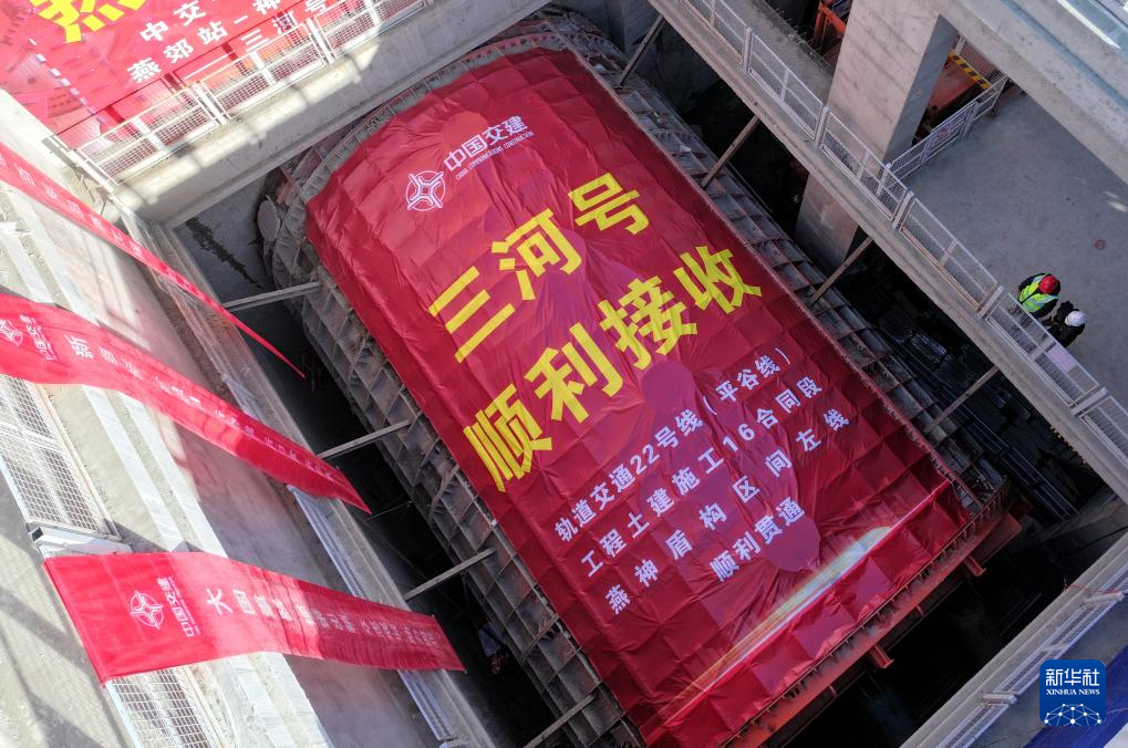 1月16日,在北京轨道交通22号线(平谷线)河北段燕郊站内,“笃行号”盾构机顺利进入接收钢套筒(无人机照片)。