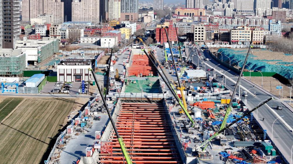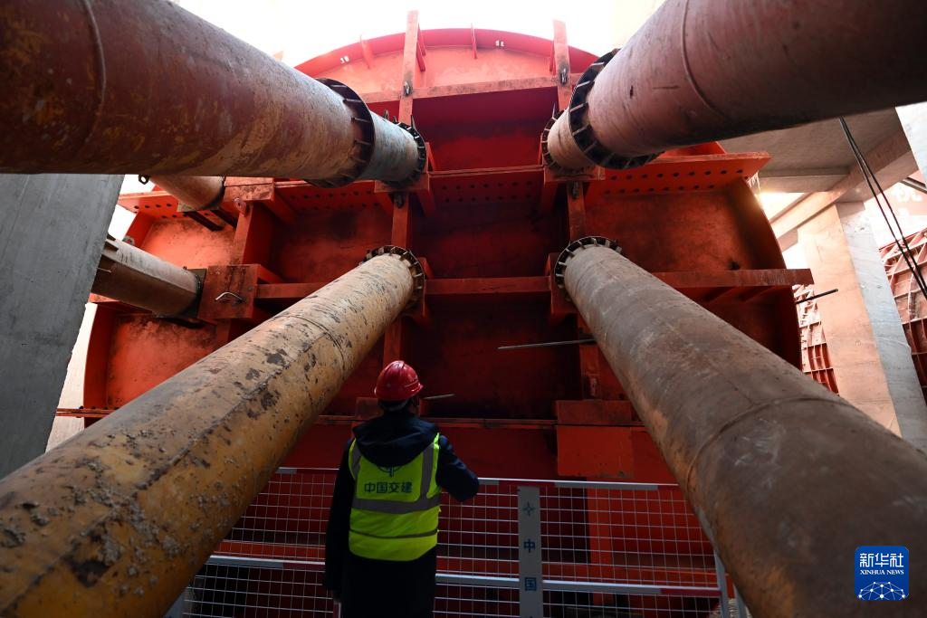 1月16日,在北京轨道交通22号线(平谷线)河北段燕郊站内,工作人员查看“笃行号”盾构机接收钢套筒情况。