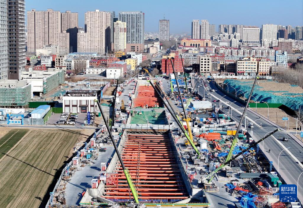 1月16日拍摄的北京轨道交通22号线(平谷线)河北段燕郊站建设现场(无人机照片)。