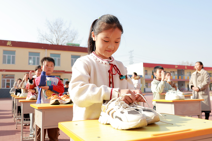 五郭店中心小学学生在参加系鞋带比赛。