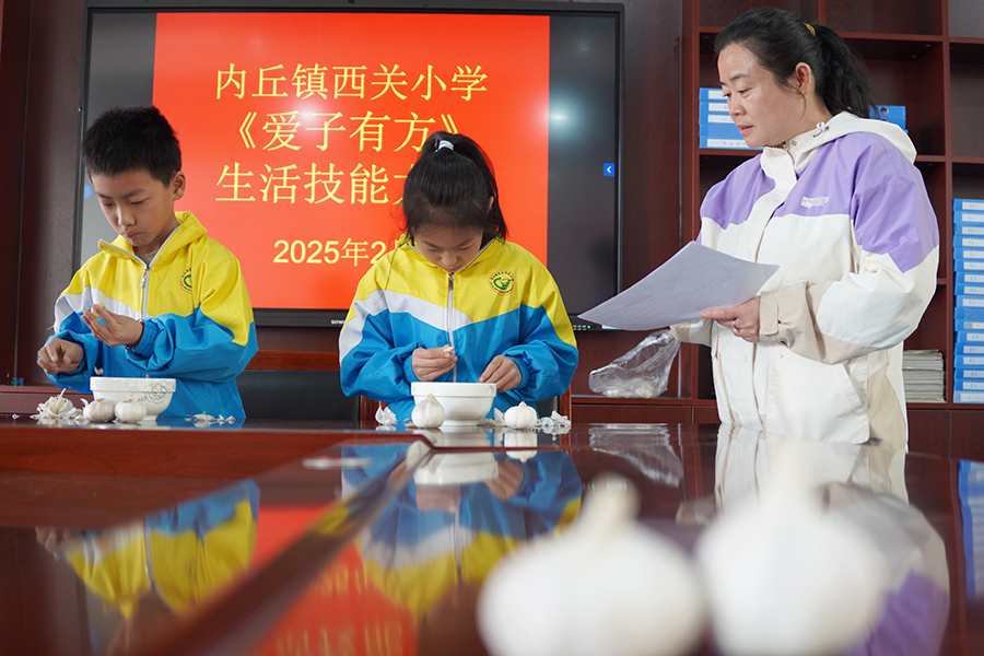 内丘镇西关小学学生在参加剥蒜比赛。