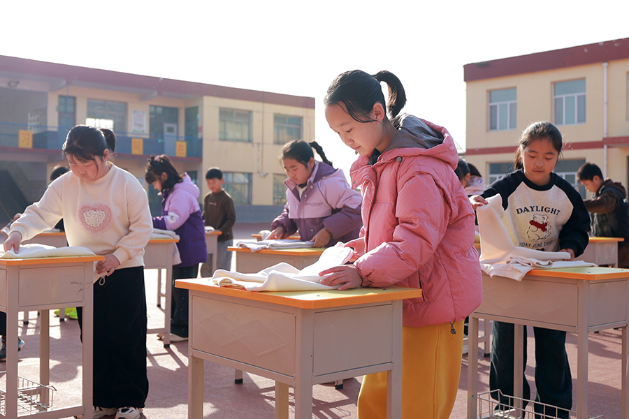 五郭店中心小学学生在参加叠衣服比赛。