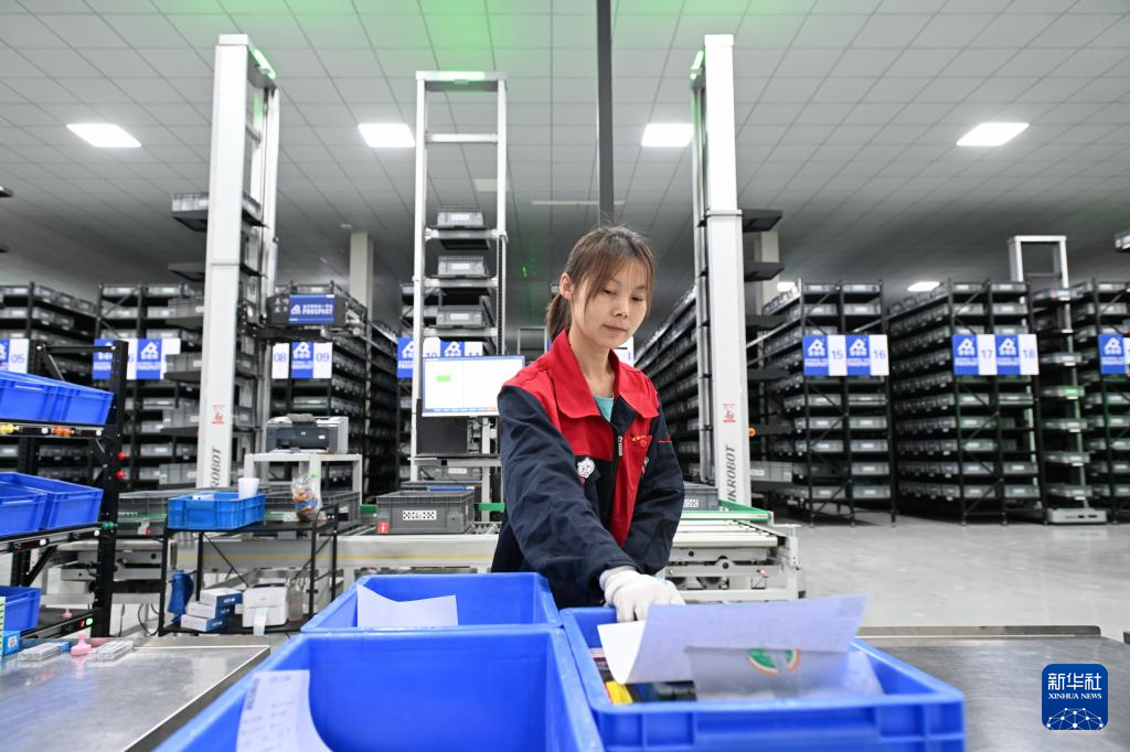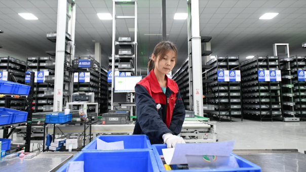 6月5日,河北省任丘市一家电力装备制造企业的工人在智能仓库内核对产品信息。