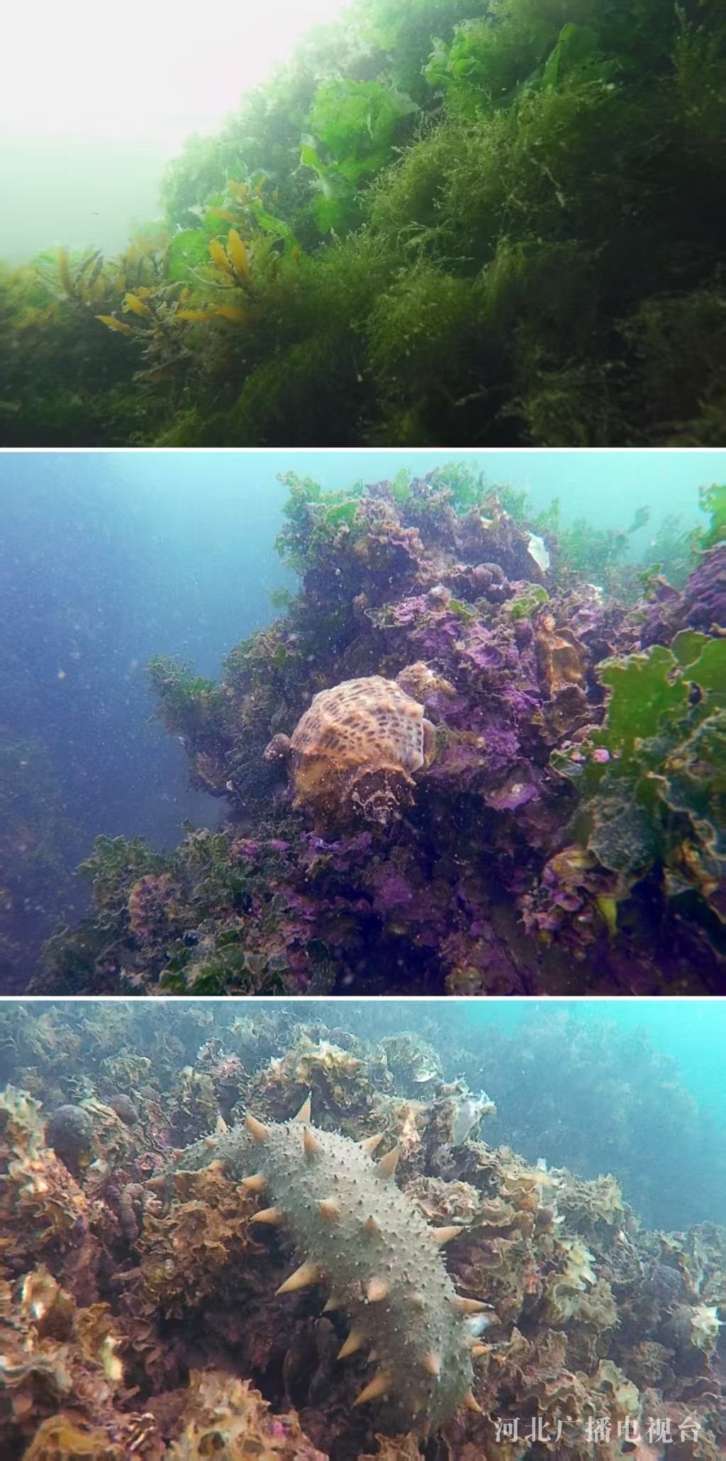 渤海祥云湾修复区域增加的海藻、海螺、海参等生物
