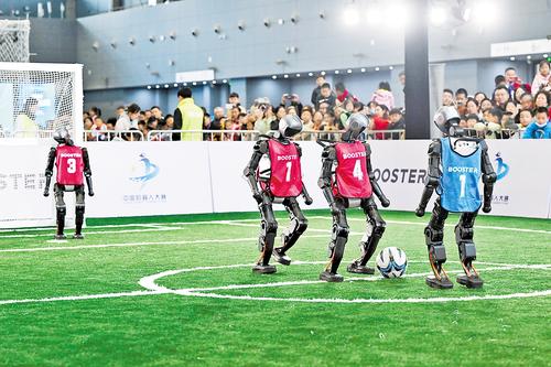 赛场上的人形机器人,由北京加速进化科技有限公司研发。“它们具有超大关节运动空间,踢球时灵活度高。”该公司现场工作人员介绍,为在比赛中取得好成绩,各高校参赛队伍精心为自己的“球员”设计了整体战术风格软件代码。