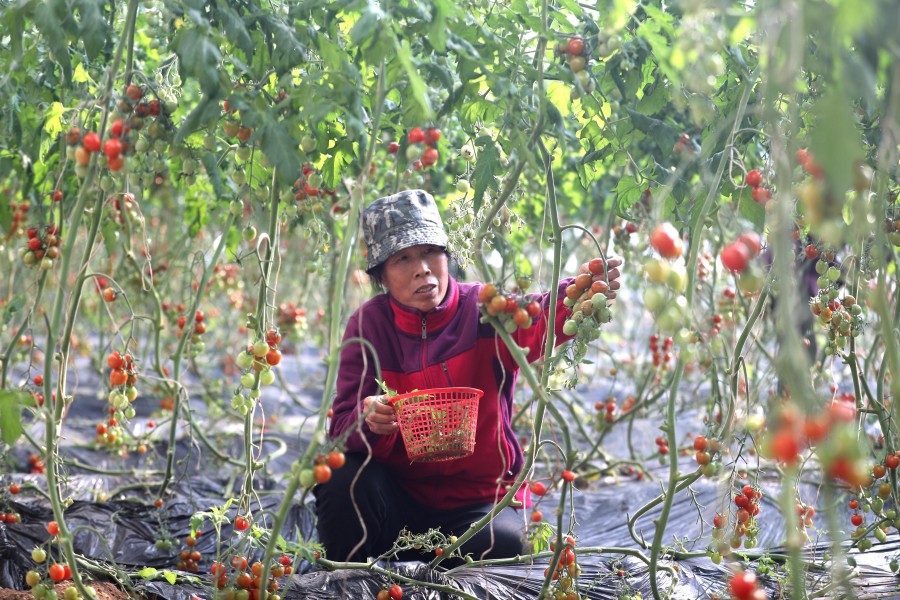 石家庄市井陉县小作村智能温室大棚里,村民在采摘小西红柿。
