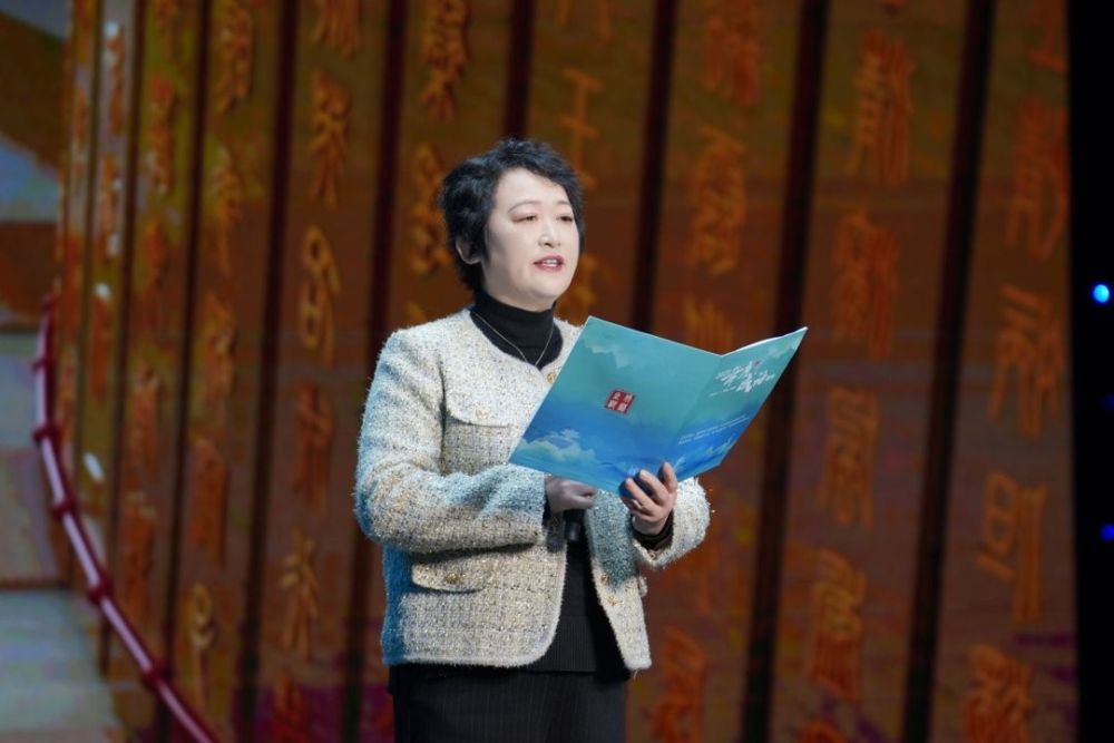 图为中国传媒大学教授、博导,国家语言资源监测与研究有声媒体中心主任邹煜发布“2025年度成语”之“海纳百川”