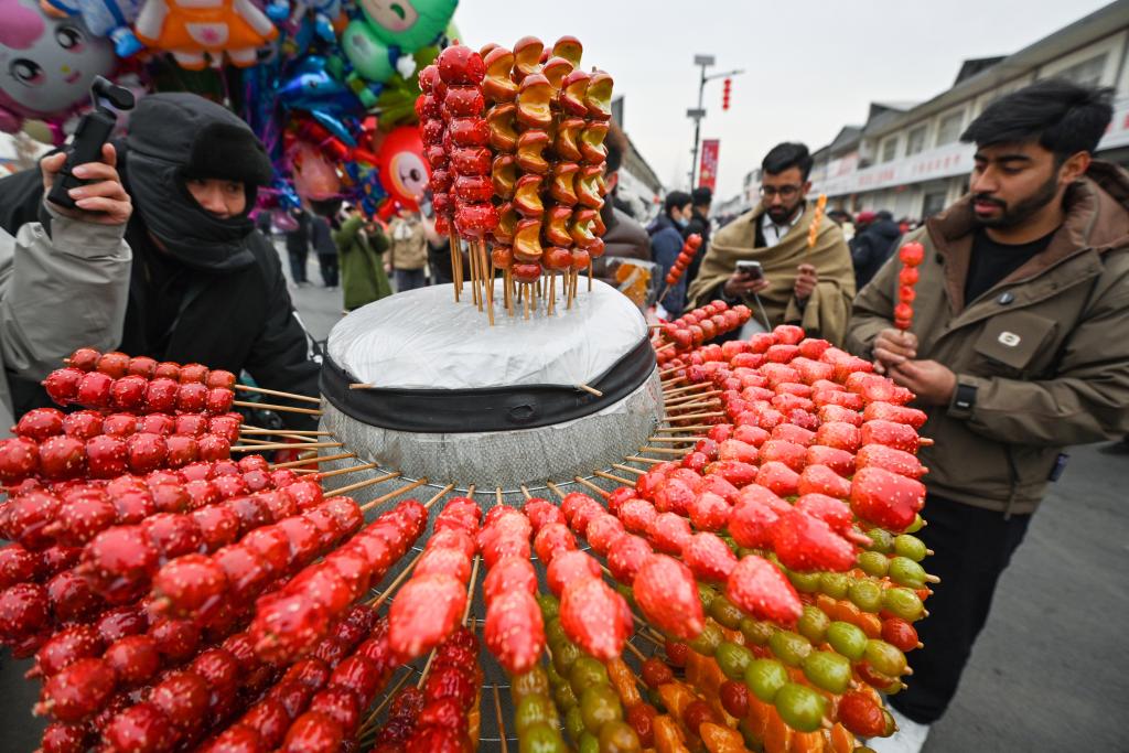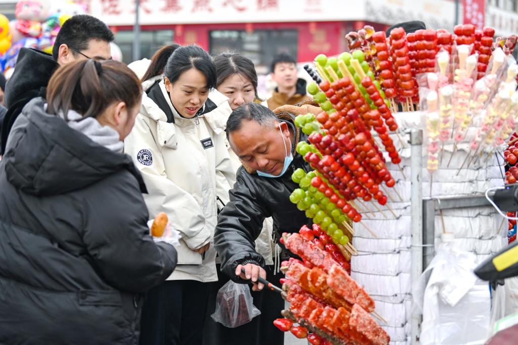 1月14日,游客在河北省元氏县南佐大集购买糖葫芦。