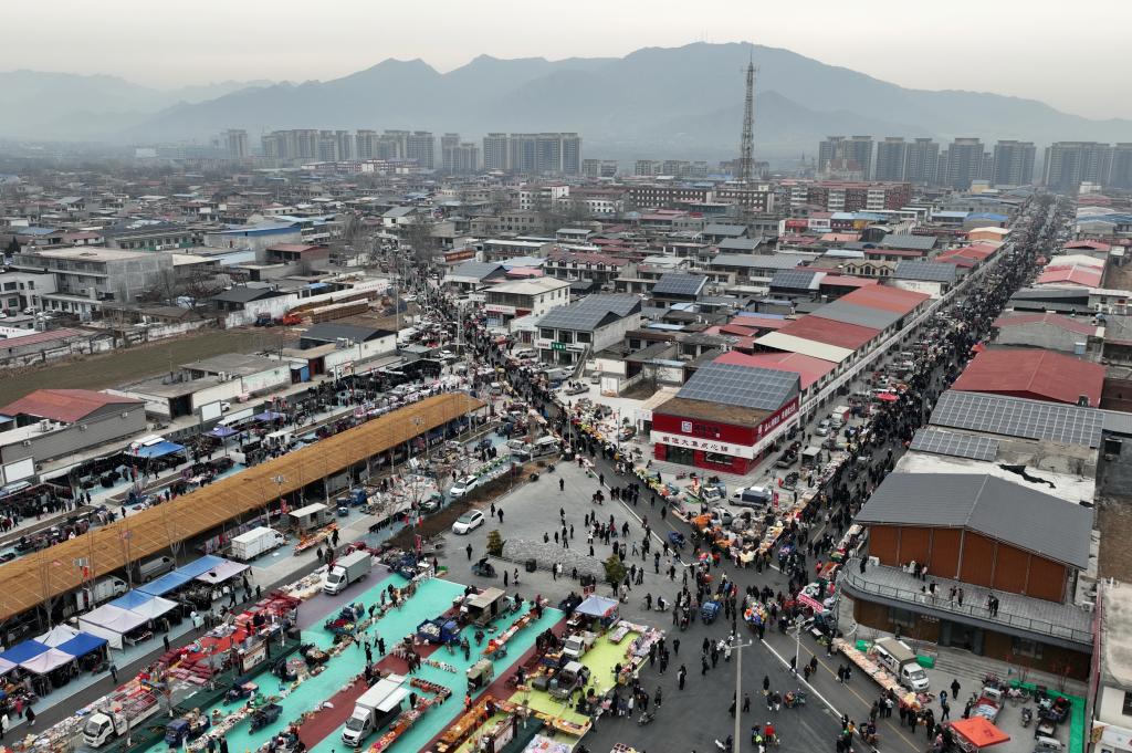 1月14日,人们在河北省元氏县南佐大集上选购商品(无人机照片)。