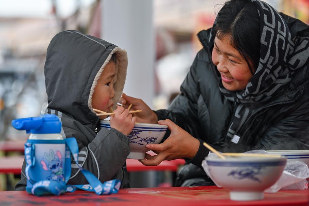 1月14日,在河北省元氏县南佐大集上,一位女士让孩子品尝地方小吃。