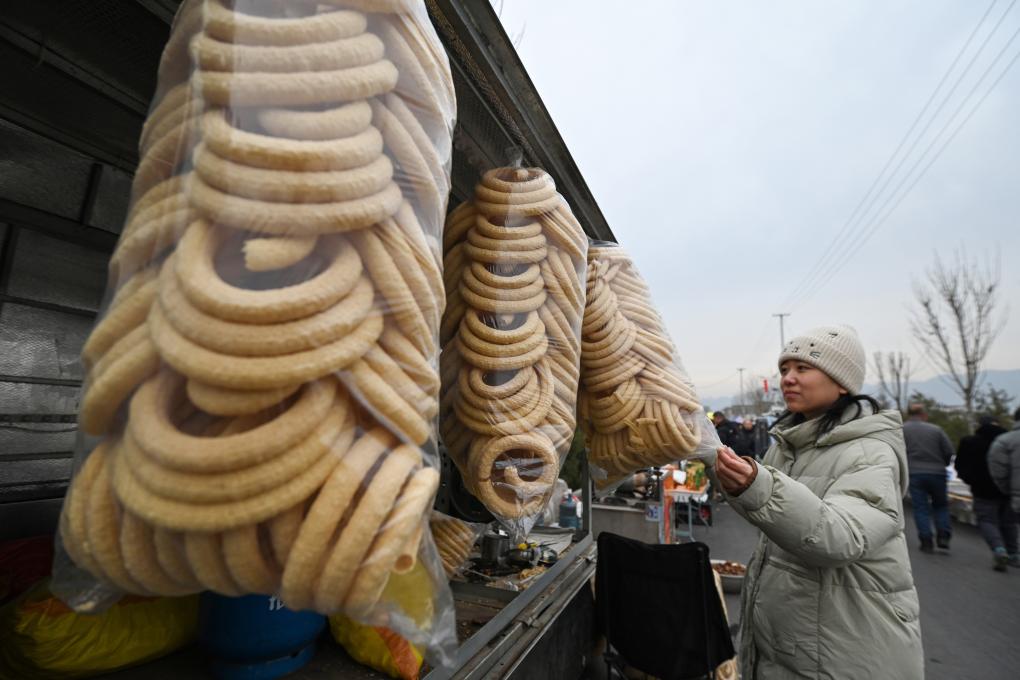 1月14日,一名女士在河北省元氏县南佐大集购买小吃。