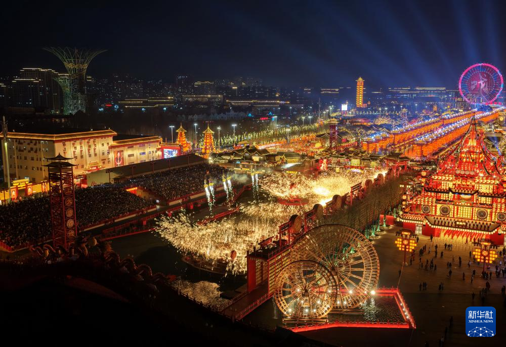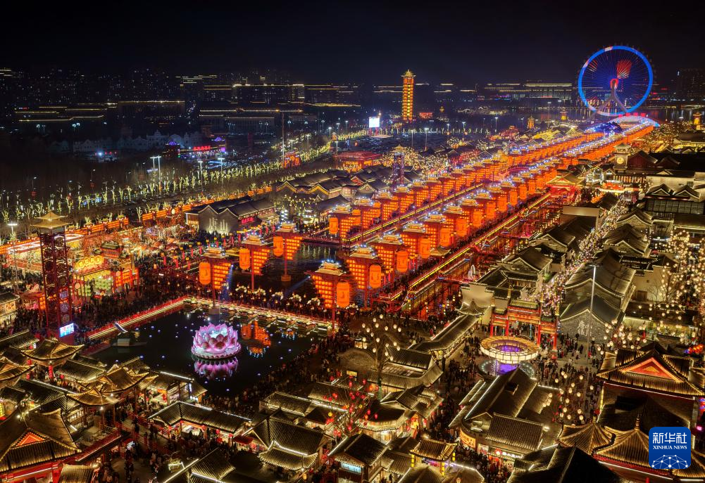 春节期间,河北省唐山市丰南区河头老街灯火璀璨、火树银花,为游客呈现出一场流光溢彩的视觉盛宴。