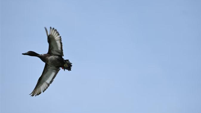 4月2日上午,全球首次青头潜鸭野化放飞活动在衡水湖举行。图为放飞后的一只青头潜鸭,在衡水湖上空飞翔。河北日报记者焦磊 摄
