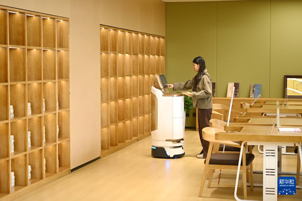 市民在雄安图书馆体验智能送书机器人(3月25日摄)。作为雄安新区首个城市级公共文化地标,雄安图书馆以智能化服务,为读者提供便捷阅读的新场景。新华社记者 朱旭东 摄