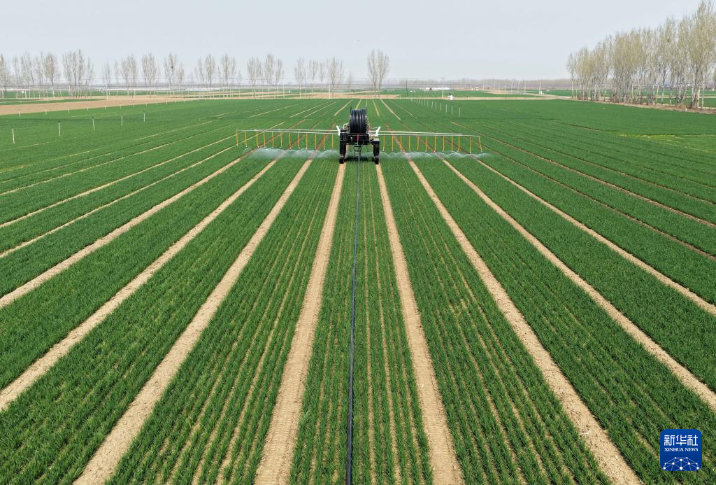4月2日,自走式水肥一体农田喷灌设备在河北省唐山市丰南区大新庄镇的冬小麦田间进行喷灌作业。