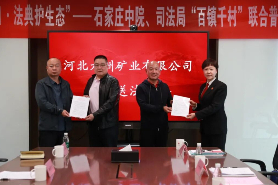 4月13日,在第57个世界地球日即将到来之际,河北省石家庄市中级人民法院党组成员、副院长张静带领中院法官,会同石家庄市司法局领导和相关工作人员,走进河北九洲矿业有限公司,联合开展“百镇千村”生态环境法典普法活动。此次活动以“世界地球日·法典护生态”为主题,通过面对面座谈交流和推送法律风险提示函,将法典精神与法治关怀送进企业、送进矿山。