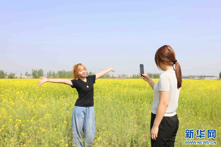 游客在油菜花田里拍照打卡,尽享春光。新华网发 田优 摄