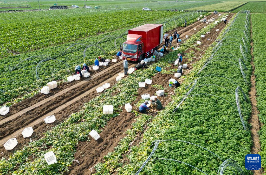 6月1日,农民在河北省玉田县玉田镇一处供京蔬菜基地内收获马铃薯(无人机照片)。