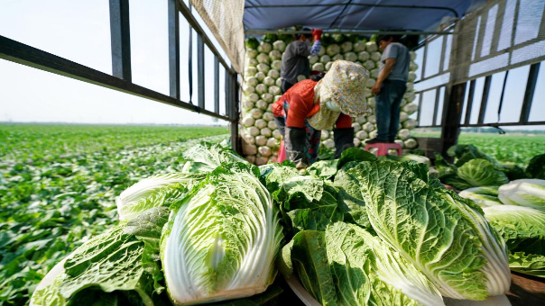 6月1日,农民在河北省玉田县亮甲店镇一处供京蔬菜基地内将收获的白菜装车。