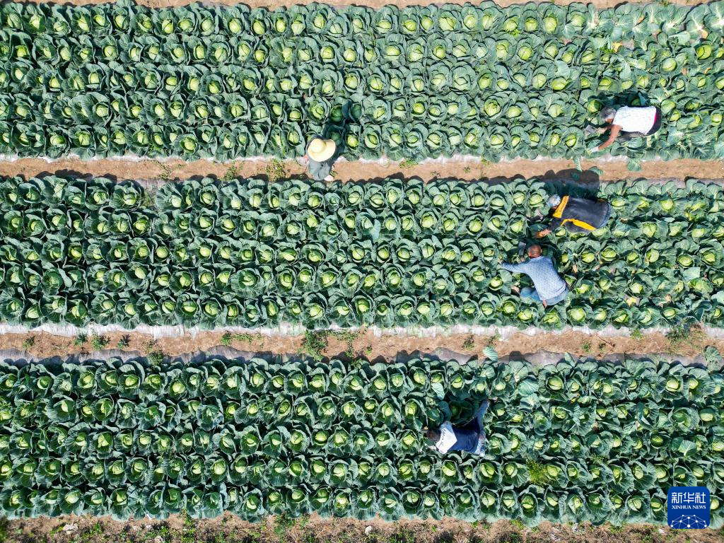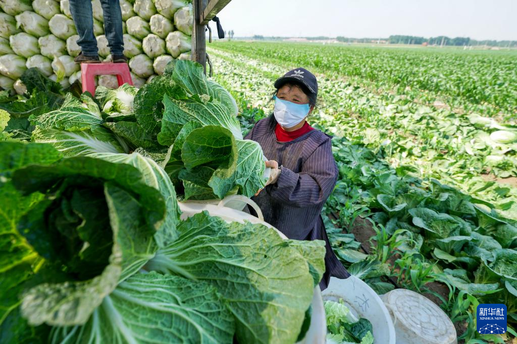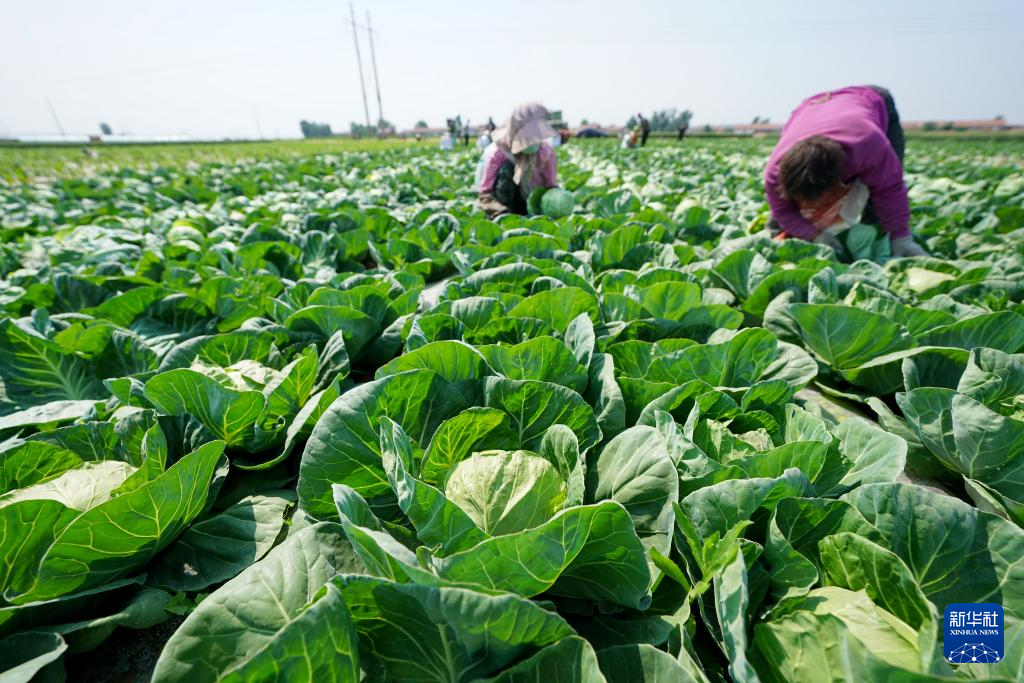 6月1日,农民在河北省玉田县虹桥镇一处供京蔬菜基地内收获甘蓝。