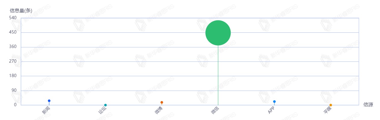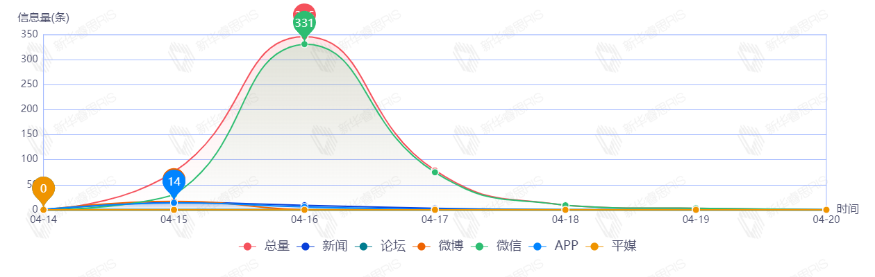 自4月14日首发至4月20日一周内,该文章在互联网上传播总量为514篇。其中4月16日是信息发布的高峰期,发布信息量为346篇文章。各信源的信息发布情况中,微信信息占比最大,其次是新闻和APP,信息量分别为448、27、22,占比分别为87.16%、5.25%、4.28%。(数据来源:新华睿思数据云图分析平台)