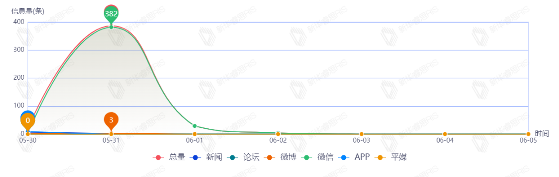 自5月30日首发至6月5日一周内,该文章在互联网上传播总量为438篇。其中5月31日是信息发布的高峰期,发布信息量为387篇文章。各信源的信息发布情况中,微信信息占比最大,其次是新闻和APP,信息量分别为416、9、9,占比分别为94.98%、2.05%、2.05%。(数据来源:新华睿思数据云图分析平台)