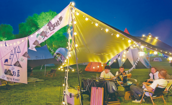一些网红露营地,“露营+”不断玩出新花样。“柏里水乡的星宿海露营地涵盖了大福地、南鱼岛六礼花园、东松岛银杏林三大湖畔特色营地,将户外生活方式与美食、观景、艺术、游乐等不同元素相结合,为游客提供多种方式的露营活动。”柏里水乡市场营销总监白晓东介绍,在这里,游客不仅可以体验露营烧烤和星空电影,生日派对、亲子活动等也是营地开展比较多的活动。此外,景区还有民俗街区、主题民宿、生态康养等特色功能区,游玩体验丰富。