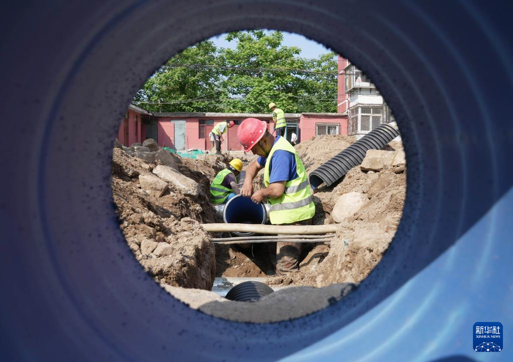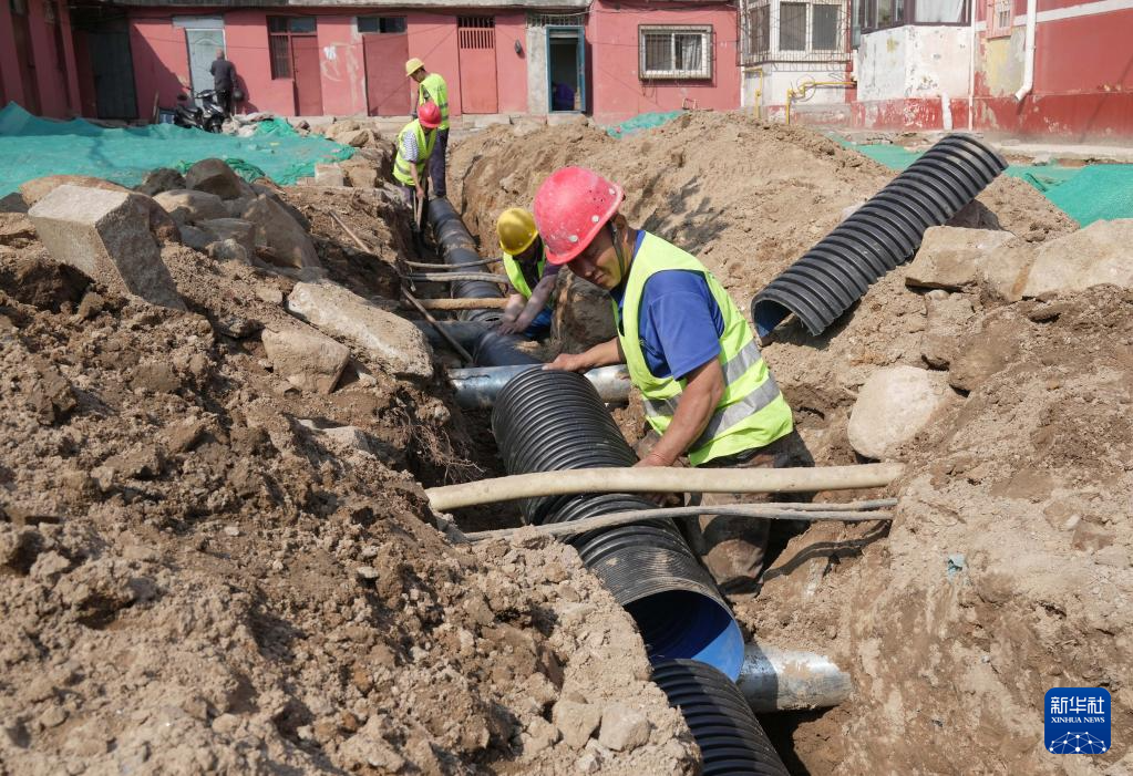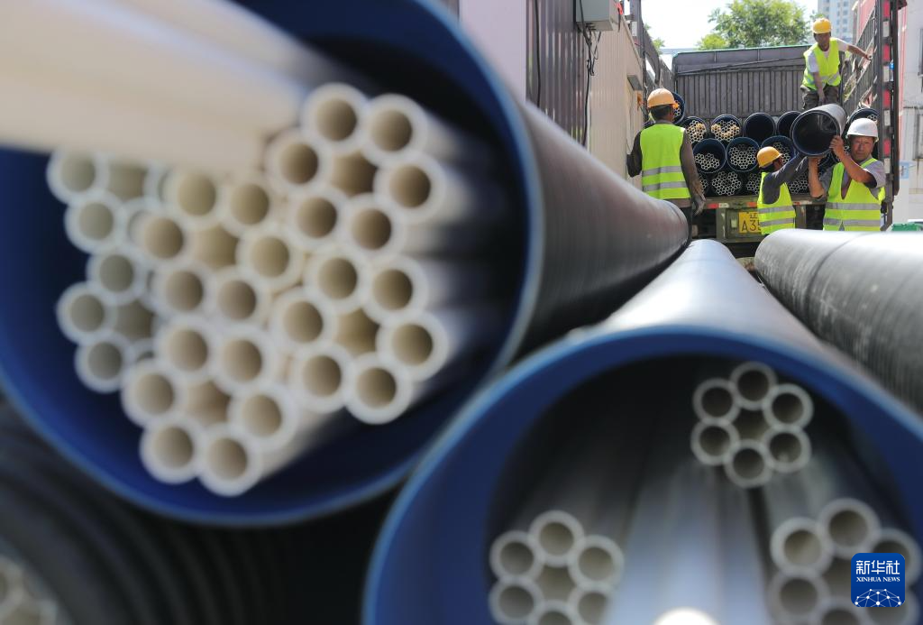 6月4日,工人在秦皇岛市海港区一老旧小区改造工地搬运管网水管。