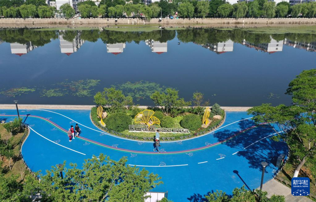 6月3日,市民从秦皇岛市海港区绿廊绿道——健步主题公园内的可透水路面上走过(无人机照片)。
