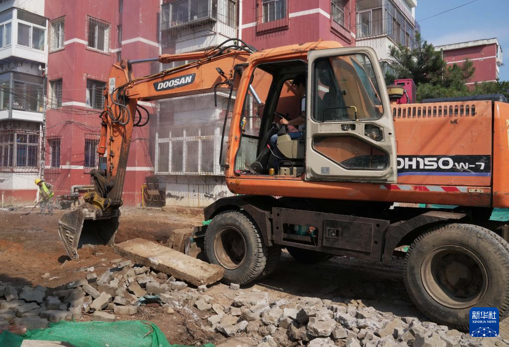6月4日,工人在秦皇岛市海港区一老旧小区改造工地施工。