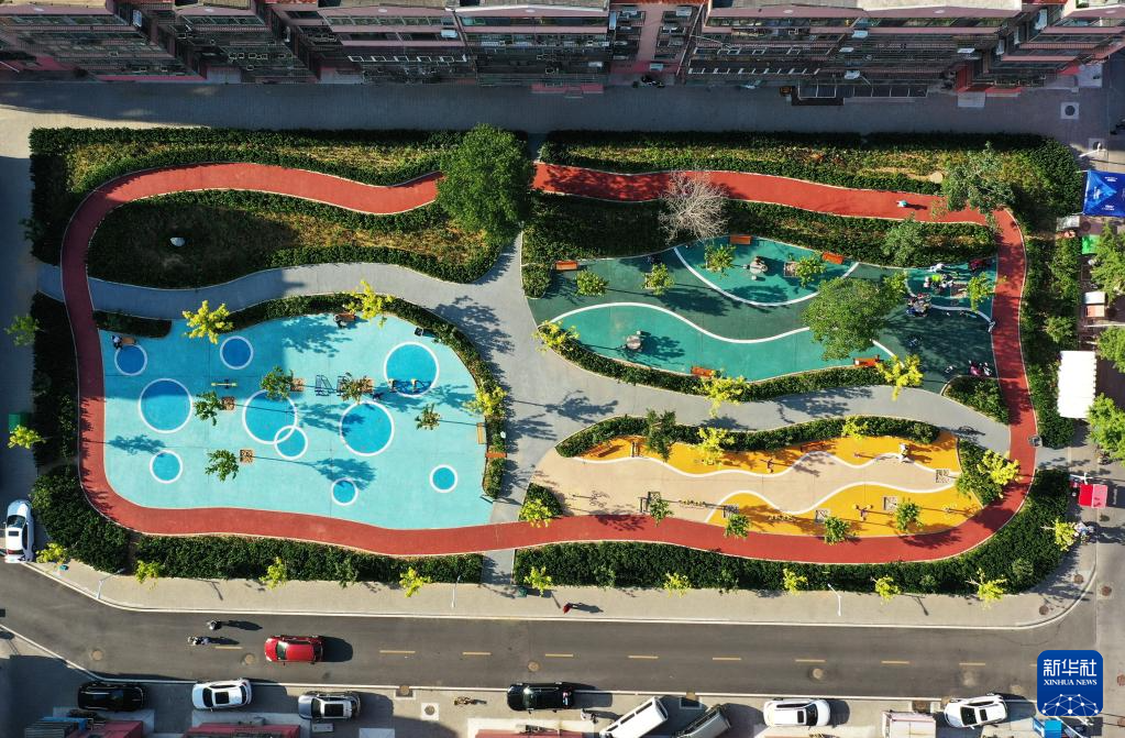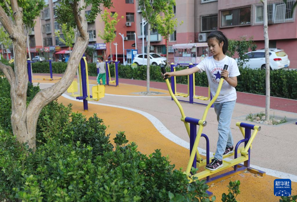 6月3日,小朋友在秦皇岛市海港区一改造完工的小区广场玩耍。这个小区广场地面为可透水地面。