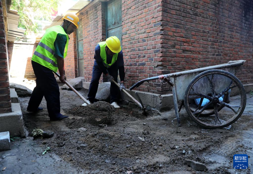 6月14日,工人在秦皇岛市海港区一老旧小区改造工地施工。