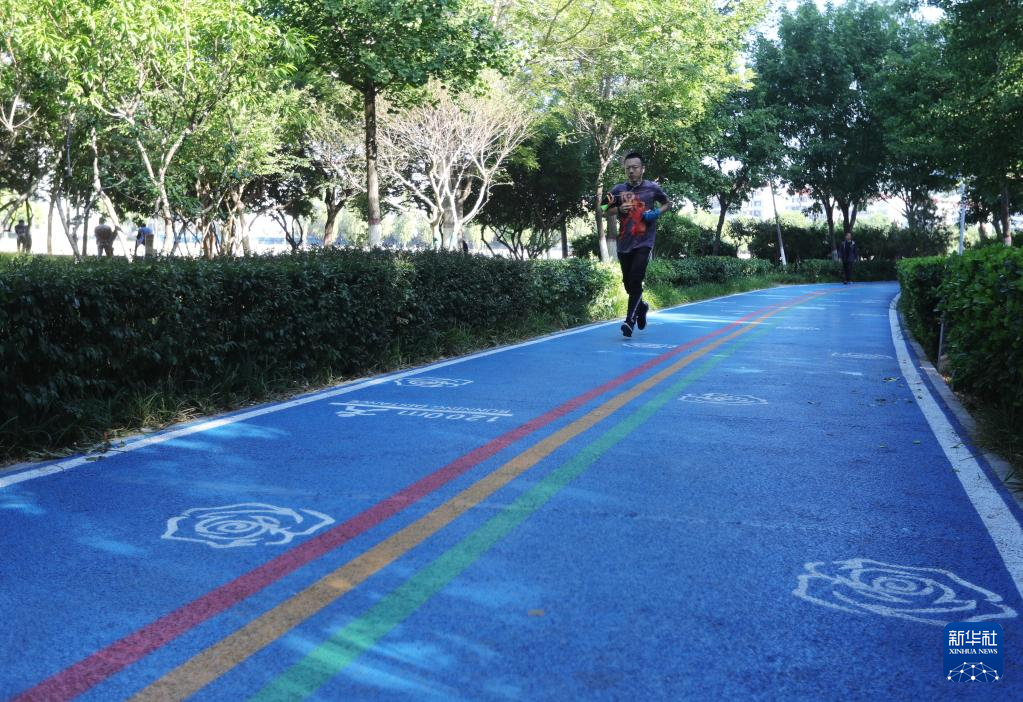 6月3日,市民在秦皇岛市海港区绿廊绿道——健步主题公园内的可透水路面上跑步。