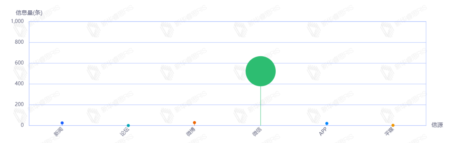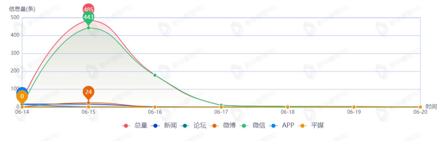 自6月14日首发至6月20日一周内,该文章在互联网上传播总量为718篇。其中6月15日是信息发布的高峰期,发布信息量为485篇文章。各信源的信息发布情况中,微信信息占比最大,其次是新闻和微博,信息量分别为642、36、24,占比分别为89.42%、5.01%、3.34%。(数据来源:新华睿思数据云图分析平台)
