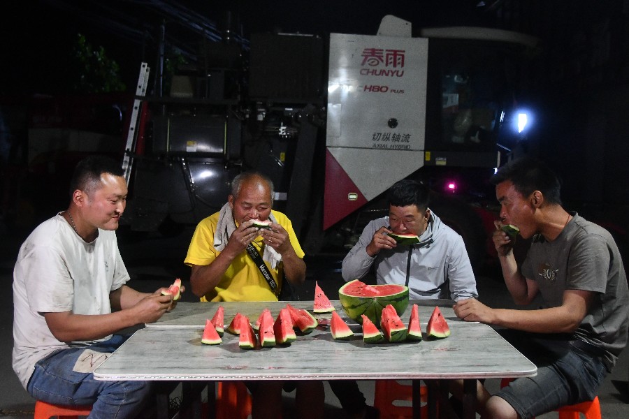 6月14日22时,在河北省邯郸市永年区小龙马乡马到固村跨区机收接待服务站,来自河南的跨区作业农机手张怀良结束了10多个小时的作业后,和其他三位农机手围坐一起,分享当天的所见、所闻、所感。(新华社记者赵鸿宇、郭雅茹)