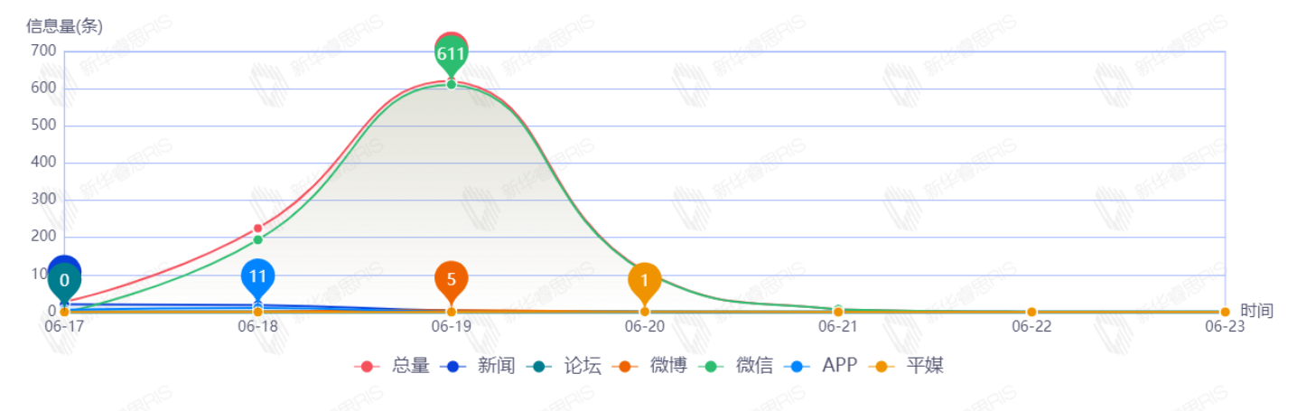 自6月17日首发至6月23日一周内,该文章在互联网上传播总量为989篇。其中6月19日是信息发布的高峰期,发布信息量为621篇文章。各信源的信息发布情况中,微信信息占比最大,其次是新闻和APP,信息量分别为919、45、18,占比分别为92.92%、4.55%、1.82%。(数据来源:新华睿思数据云图分析平台)