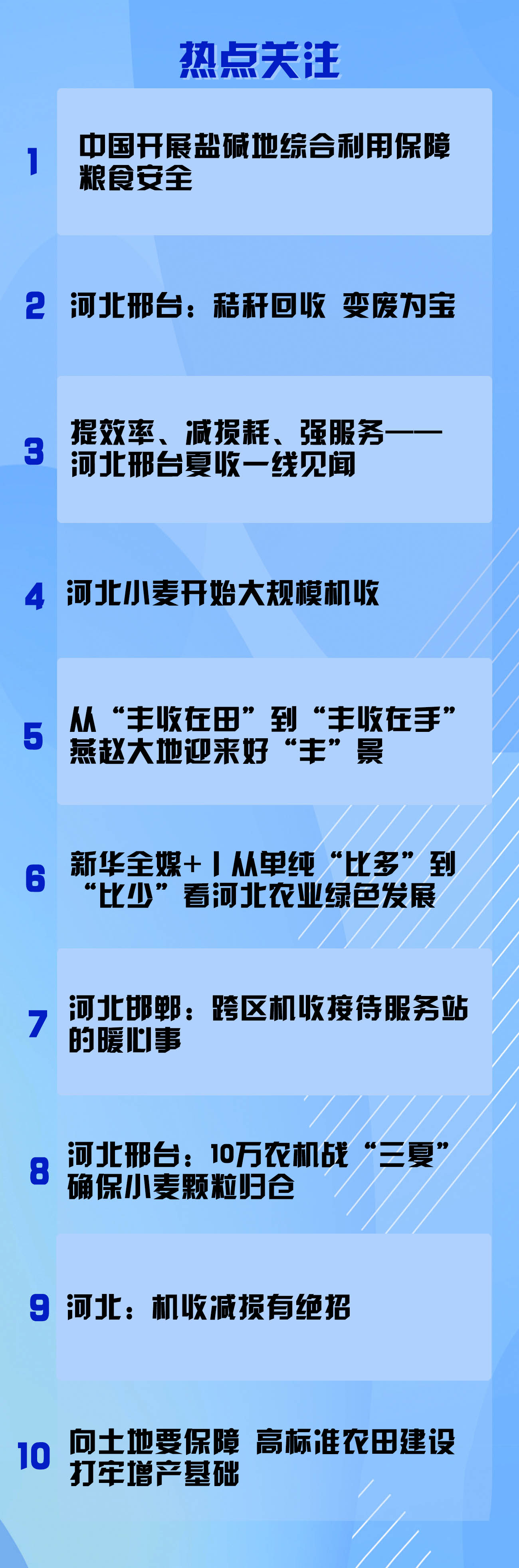 随着河北省麦收工作的顺利推进,多地开展机收减损相关活动。衡水市阜城县组织农机手开展机收减损大比武,所有机手收获一块地,对小麦机收损失率进行评定排名,通过比赛引导农机手深挖机手减损的潜力,确保粮食应收尽收。在廊坊市,当地农机部门对机手进行相关技术培训,降低损失率。(新华社记者张硕 报道员王钟、李强)