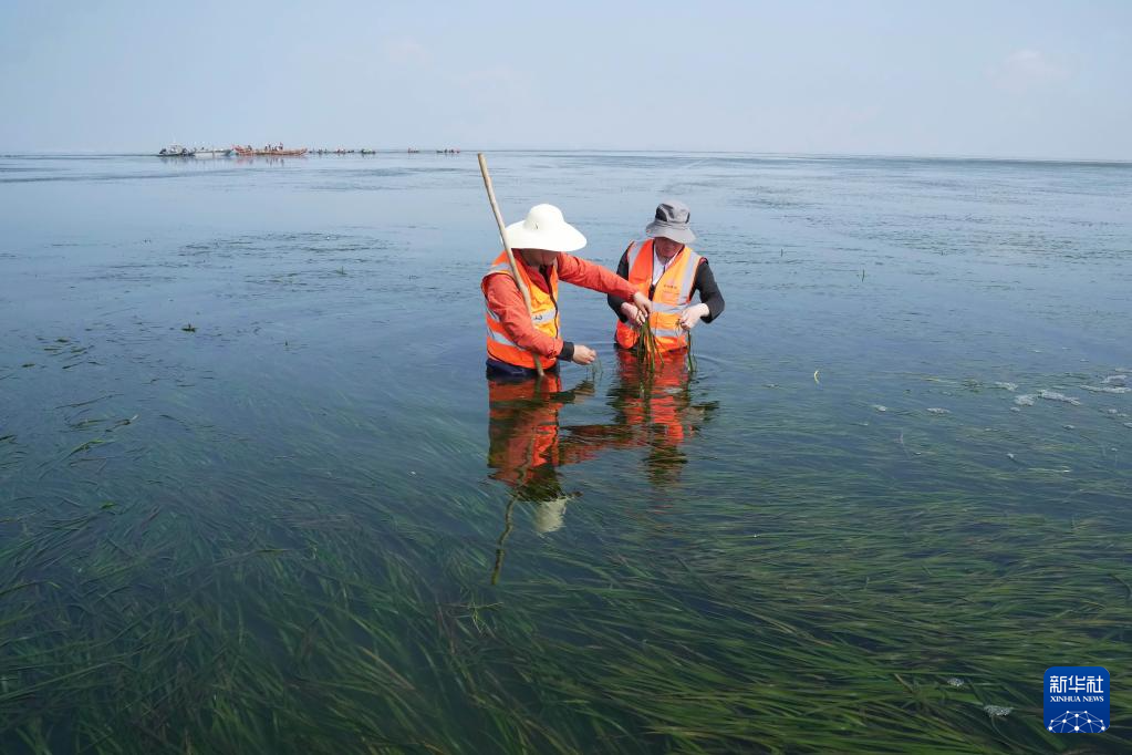 唐山祥云湾海洋牧场的技术人员在察看鳗草海草床的情况(2021年8月11日摄)。