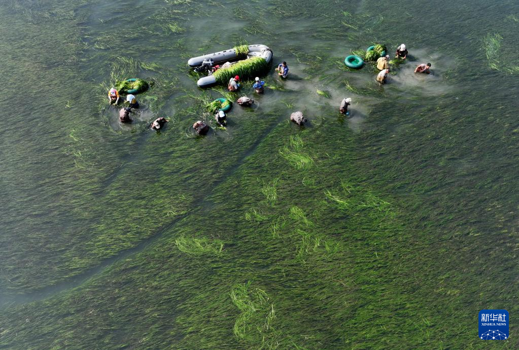 6月25日,中船环境集团的工人在唐山市曹妃甸区海洋生态保护与修复项目鳗草苗采集海域工作(无人机照片)。