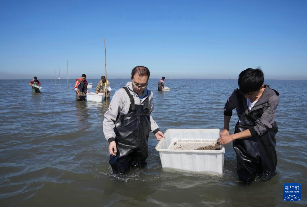 唐山祥云湾海洋牧场的技术人员在海草种植试验区播种鳗草种子(2021年10月12日摄)。