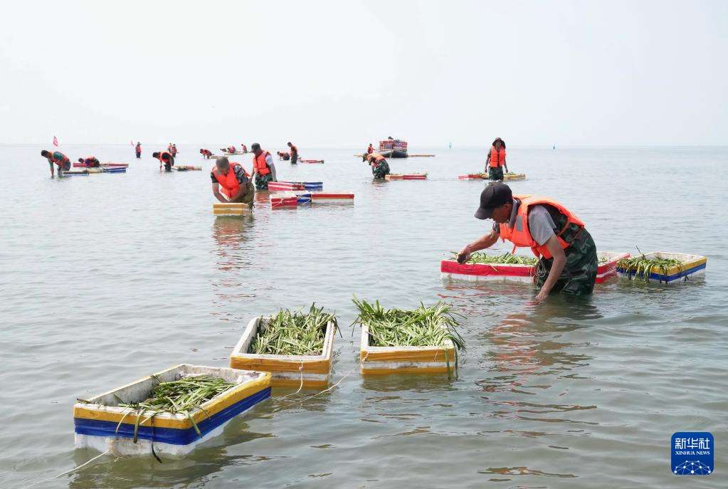6月25日,中船环境集团的工人在唐山市曹妃甸区海洋生态保护与修复项目海域栽种鳗草苗。