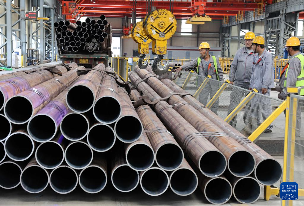 7月11日,在承德市鹰手营子矿区一家无缝钢管生产企业,工作人员在进行装车前准备工作。